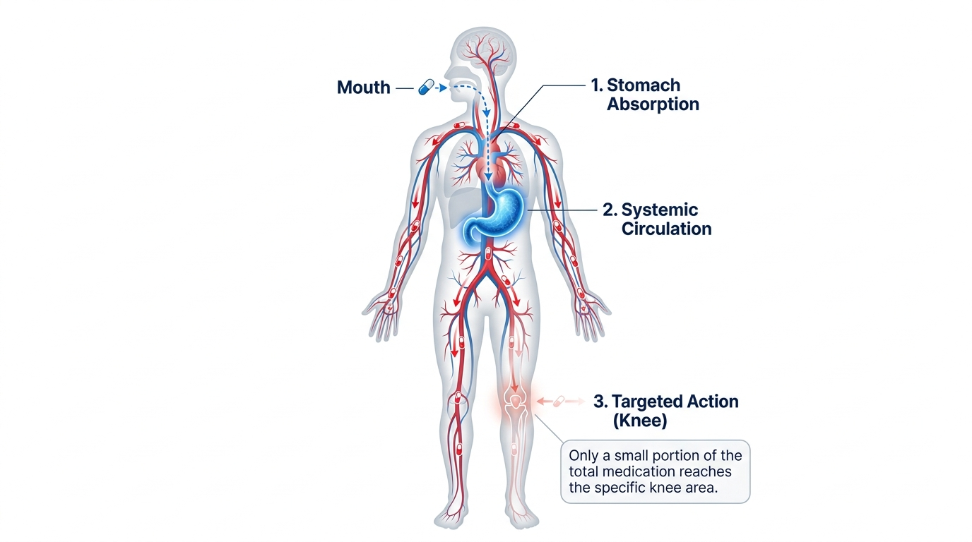 When you swallow a painkiller, it travels through your digestive system, enters your bloodstream, and circulates through your entire body. Only a fraction of the active ingredient reaches the actual site of pain. The rest affects your stomach, liver, kidneys, and other organs.