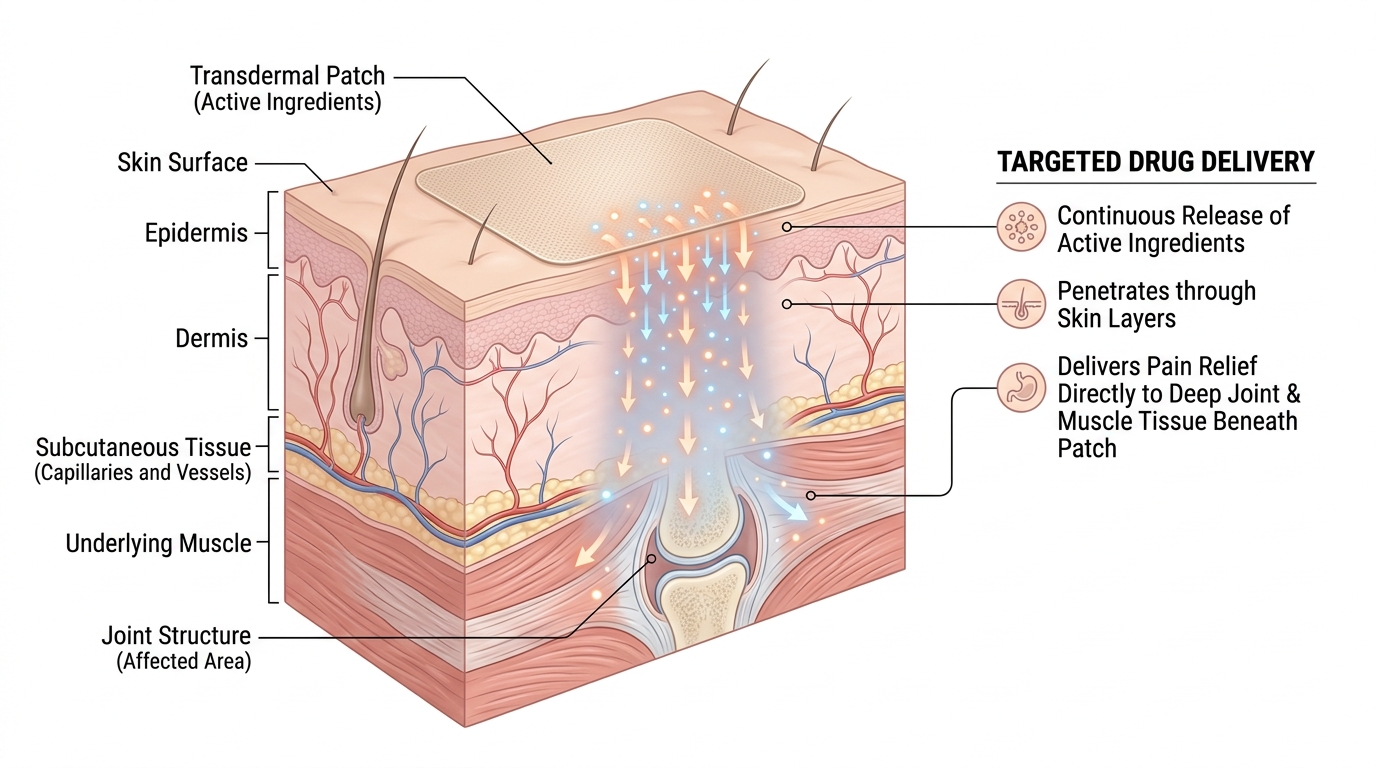 Transdermal patches deliver active ingredients directly through the skin to the underlying tissue. The compounds bypass your digestive system entirely and concentrate at the pain site — exactly where they're needed.