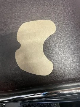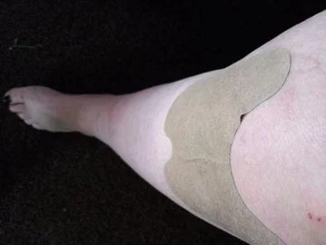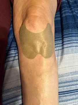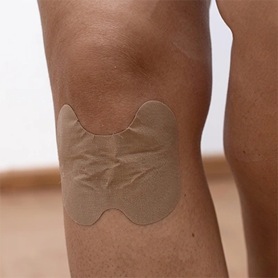 Remove the protective backing and press the patch over the knee joint. Smooth out air bubbles from the center outward for full skin contact.